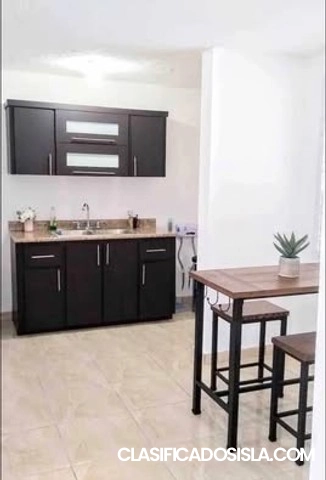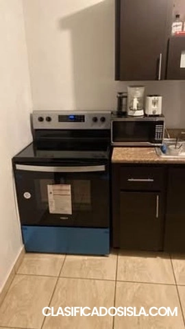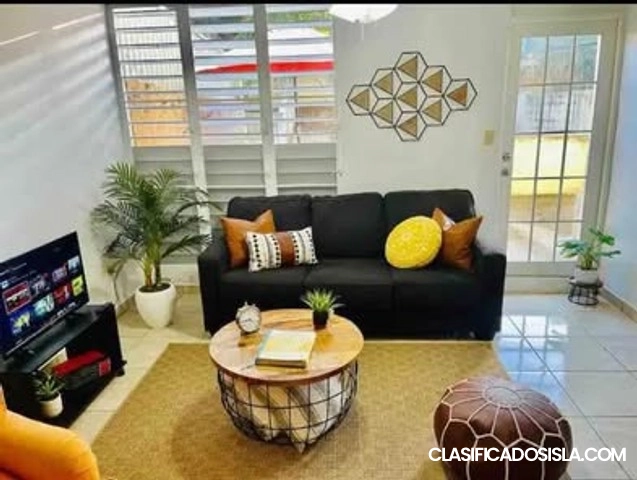 Casa de primer nivel amueblada y decorada, calle sin salida, remodelado pisos y baño, incl agua, cisterna, estufa, nevera, microondas, utensilios de cocina, ollas, lavadora, secadora, todos los muebles de sala, sofá cama Queen, tv, wifi, comedor, cuarto cama Queen, aire inverter, closet en puerta espejo, calentador de agua, patio trasero con juego de patio, screens nuevos, en sala abanico techo. 2 estacionamiento (1 de ellos bajo techo). A 5 min mall San Juan y 8 del aeropuerto, a 10 de Hato Rey...