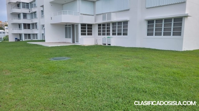 Apartamento Garden con hermosa vista en el Condominio Costa Esmeralda – Ceiba. 3H/2B con área de laundry, sala/ comedor, cocina. Equipado con 3 aires acondicionados, Nevera, Calentador, Estufa, Lavadora/Secadora, calentador, tormenteras, cisterna con bomba de presion. Disponible de inmediato. Facilidades recreativas, gimnasio y piscina con control de acceso y 2 estacionamientos.