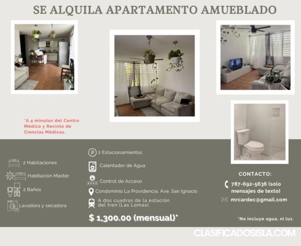 Se renta apartamento amueblado recién remodelado en Cond La Providencia. Apartamento de 3 dormitorios y 2 baños con sala, comedor, cocina, balcón, lavadora y secadora. Ubicado en el piso 6 Cuota de mantenimiento incluida. Incluye 2 estacionamiento asignados. No incluye agua ni luz. No se aceptan mascotas. Características adicionales: - Control de acceso y Elevadores - Cisterna y planta eléctrica en áreas comunes - En excelente localización de fácil acceso a vías principales y estaciones del Tren...