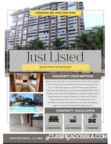 Propiedad de Fannie Mae HECM - Condado del Mar, San Juan. Apartamento ubicado en el quinto piso. Edificio alto, frente a la playa, con acceso controlado, seguridad las 24 horas, admite alquileres a corto plazo, cancha de tenis, piscina, 1 estacionamiento, 2 dormitorios y 2 baños, 1,000 pc de construccion aprox. La cuota mensual de mantenimiento de la asociación de residentes es de $363.00 e incluye el consumo de agua de hasta $30.00 al mes. Seguro anual: $2,003.67. Excelente ubicación en Condado...