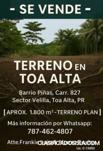 TERRENO EN TOA ALTA [1,800 MC APROX] TERRENO LLANO "Plano" , BARRIO PIÑAS, CARR. 827, SECTOR VELILLA, TOA ALTA PR. *MAS INFORMACIÓN POR WHATSAPP (787) 360-4456 - ALONSO REALTY LIC.13453.